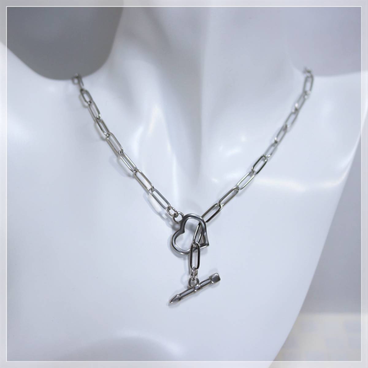 - N7643/ハートと矢 オールステンレス マンテルネックレス 銀色 ステンレスチェーン オーバルリンクチェーン 4mm幅 幅広 太め 恋愛のお守りに