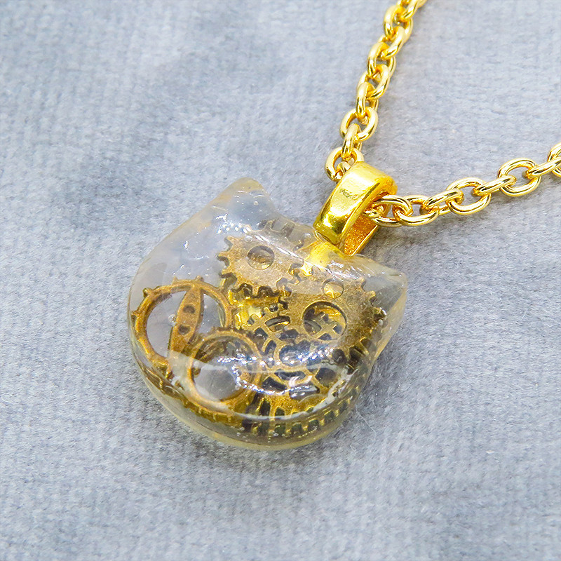 - 猫フェイスチャーム スチームパンク風 アンティークゴールドの歯車を封入したクリアレジンチャームネックレス 長さ調整可