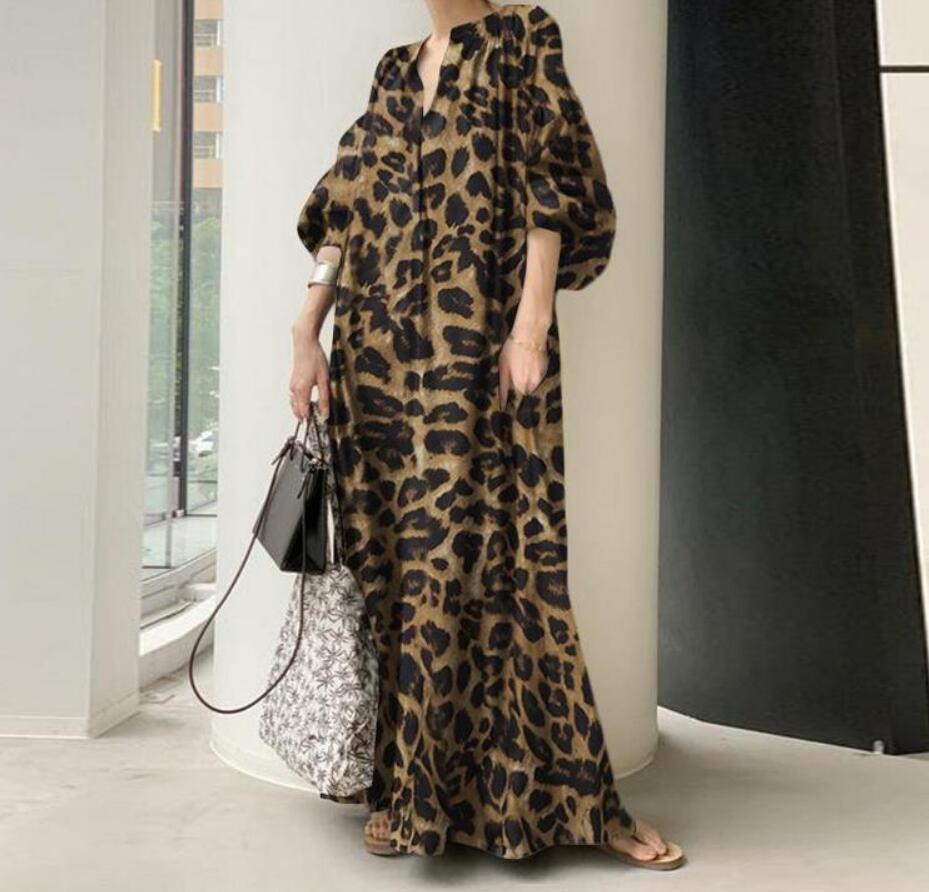 - 秋季 上質 Vネック プリント柄 ロングワンピース マキシ丈 体型カバー 大きいサイズ ふわふわ袖 / コーヒー M-XL選ぶ