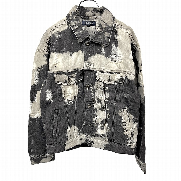 > 【新品】DIVINER デニム ジャケット Gジャン ジージャン ブリーチ加工 ダメージ加工 綿100% M ブラック 黒×グレーベージュ メンズ