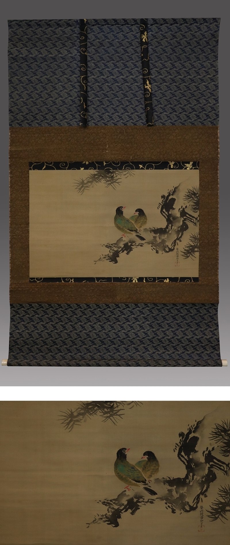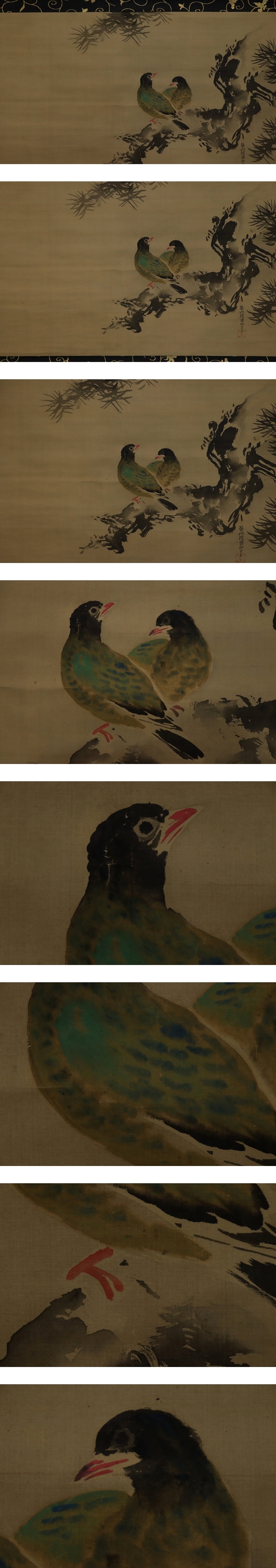 - 【真作】狩野栄川【大幅・松鳩図】◆絹本◆合箱◆二重箱◆掛軸 w08099
