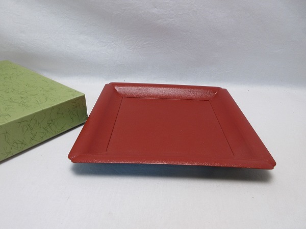 > 510088 【 未使用 茶道具 天然木製 朱叩塗 裏青漆 若狹盆 干菓子器 紙箱 】 検)煎茶道具 茶入盆 花入盆 茶器 四方盆 菓子器 茶道ⅰ