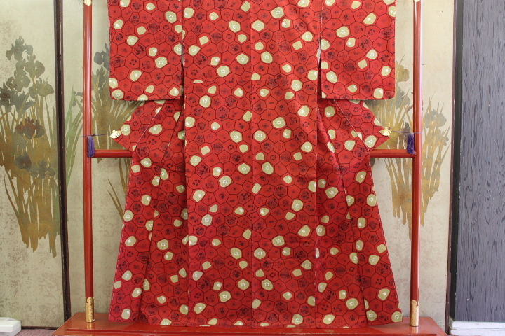 > きもの今昔6418 小紋のきもの 広衿袷手縫い仕立て 正絹浜紬生地えんじ色地 崩し亀甲に中花柄 身丈151cm