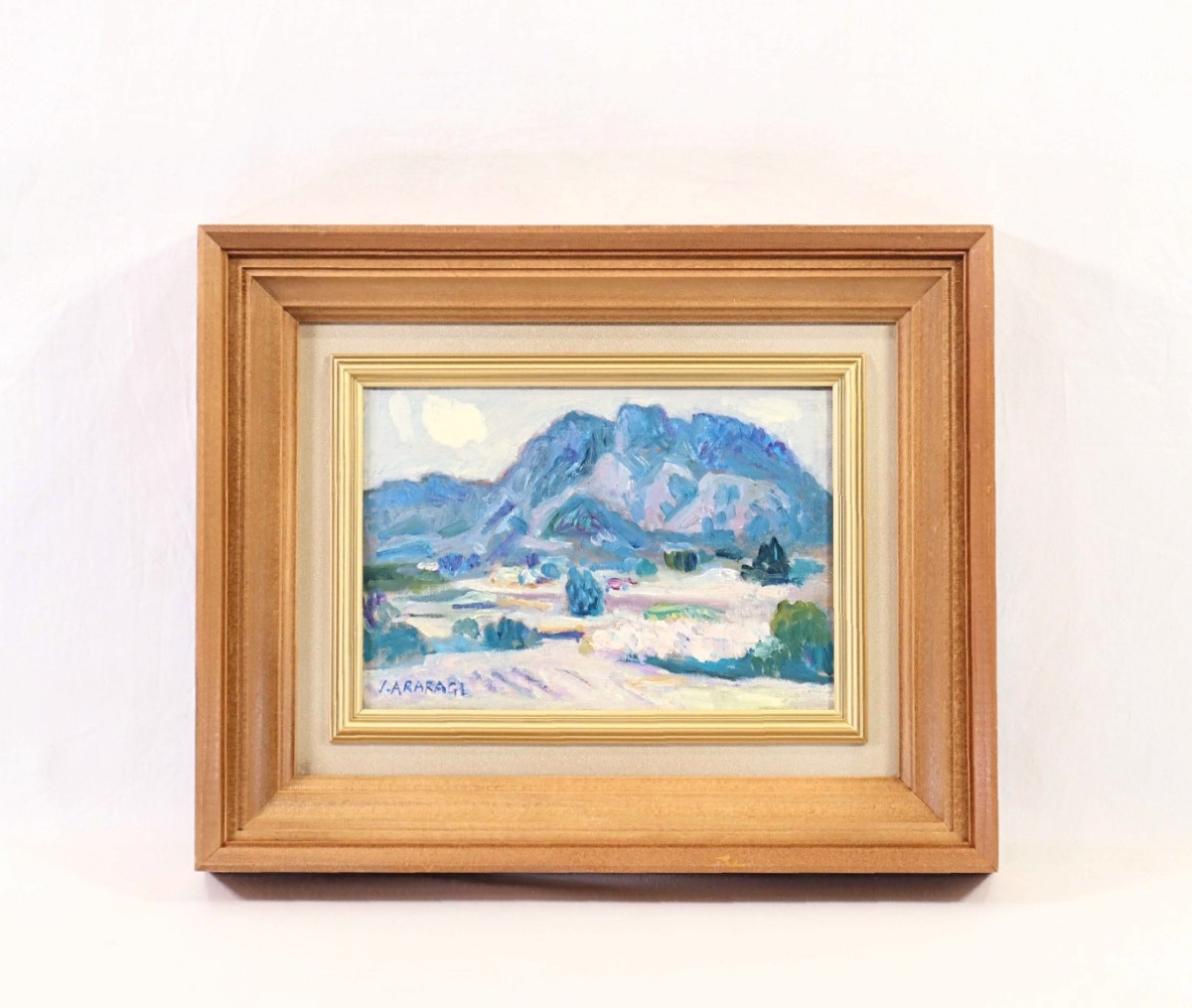 > 真作 蘭市郎 1987年油彩「陽春」画寸23×16cm SM 群馬県出身 新槐樹社委員 山村集落に小高い山を描く 柔らかな筆致、詩情豊かな風景画 8546