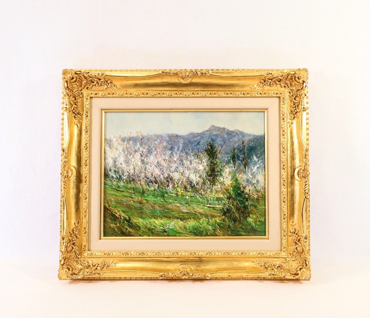 - 真作 安藤育宏 1987年油彩「梅郷好日」画寸 F6 栃木県出身 白日会委員 惹きつけられる色彩表現 埼玉県越生町の越辺川沿いに広がる梅林 8576