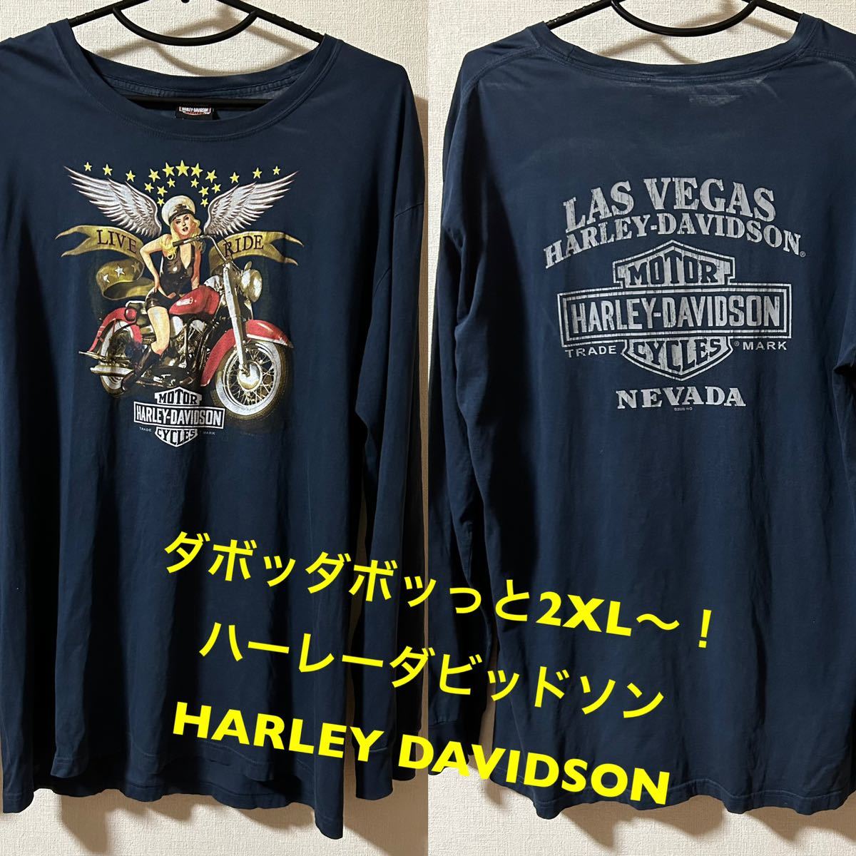 > ダボッダボッっと2XL〜!ハーレーダビッドソン 古着長袖TシャツロンT ネイビー ピンナップガール HARLEY-DAVIDSON ビックT