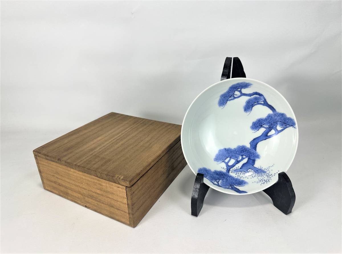 - E54●清風 与平【松紋青華皿】青華 染付 皿 陶器 共箱 在銘 総重:約241g 現状品
