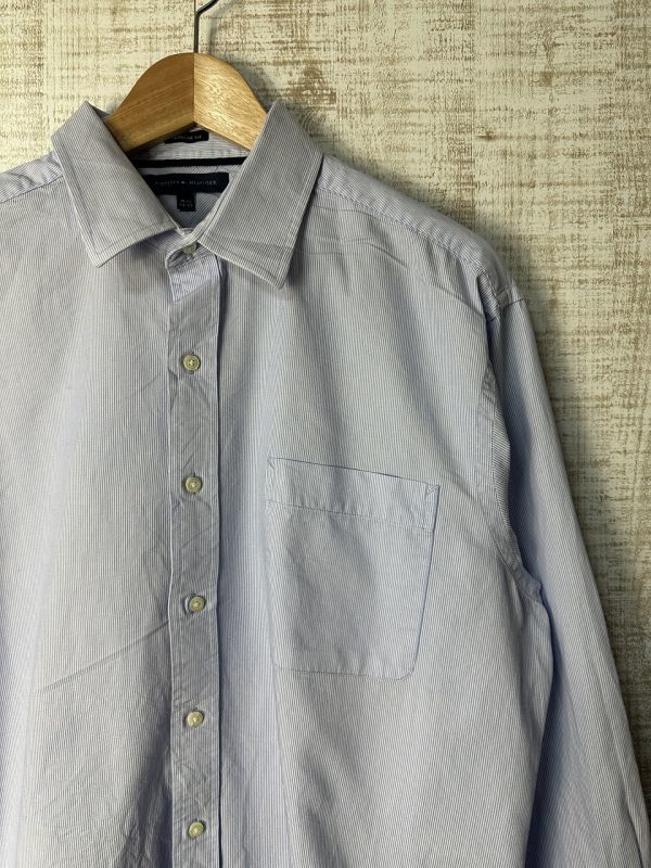 > ☆US古着 TOMMY HILFIGER トミーヒルフィガー コットンシャツ 綿シャツ ストライプ柄 水色ブルー【32-33(Lくらい)】コットン ◆4368◆