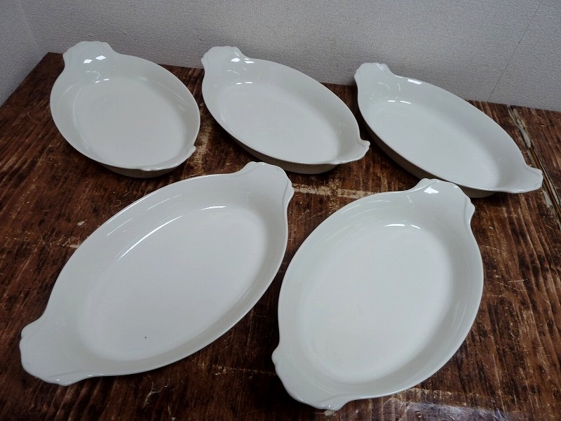 - (☆BM)陶器製/オーバル ホワイト 5点セット 横幅36.5㎝ 無地 白 グラタン/コキール/オーブン/プレート 深皿 業務用 ビュッフェ 洋食器