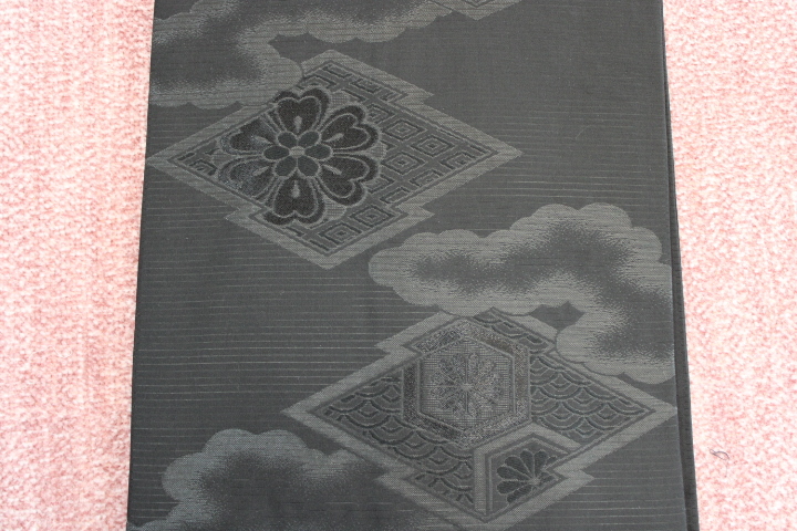 > きもの今昔6628 黒の礼装 夏用喪の名古屋帯 正絹7本絽織 雲取りに松皮菱中はな菱文様 仕立シツケ糸付き未使用品