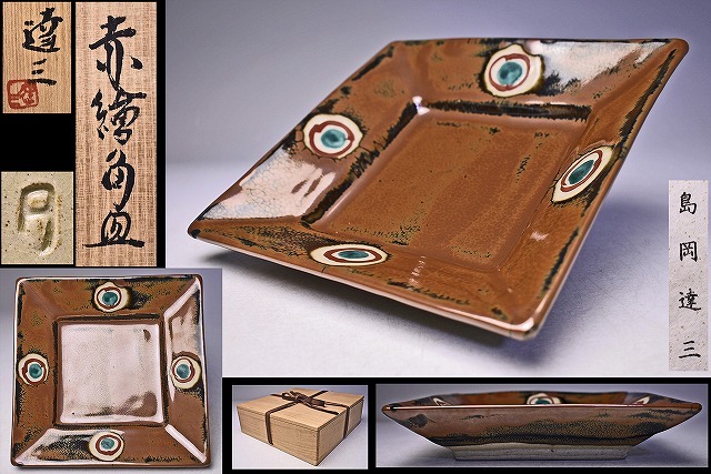 > 島岡達三 ★ 赤絵 角皿 ★ 共箱 栞 ★ 人間国宝 ★ 師: 浜田庄司 ★ 氏らしい力強く飾っても映える逸品 ★ 民芸陶 ★ 検 ゲルトクナッパー