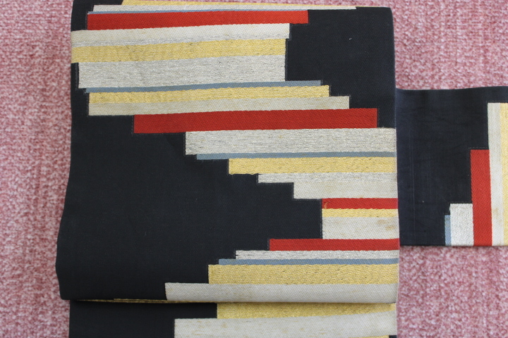 > きもの今昔6651 名古屋帯 西陣織九寸名古屋帯 錦織地黒地 金銀紅白横柄 帯の長さ350cm