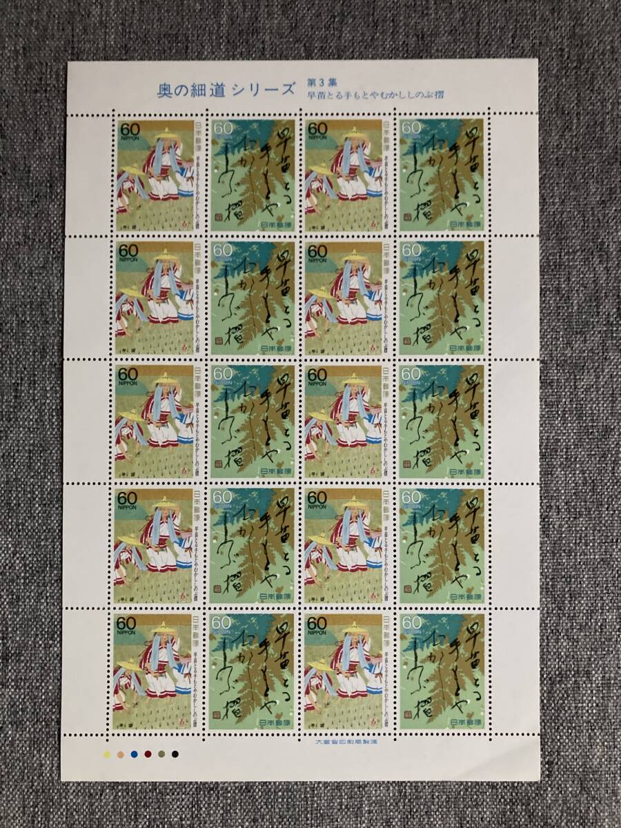 > ★未使用 奥の細道シリーズ 第3集 早苗 句の書 早苗とる 手もとやむかし しのぶ摺 松尾芭蕉 昭和62年 1987年 2種連刷 切手シート 60円20枚
