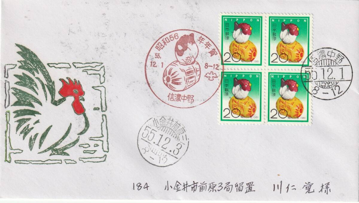 - FDC 1980年 年賀切手 にわとり 20円4貼2消し 肉筆実逓