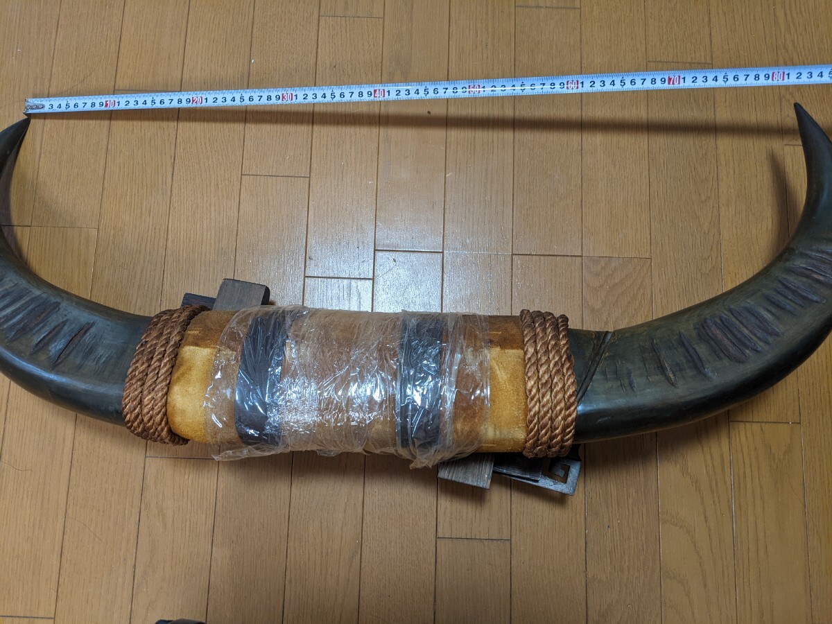 - IY0657 水牛の角 幅約82㎝×高さ約40cm 奥行き約10cm台座付き 置物/飾り/骨董品/インテリア/風水 現状品