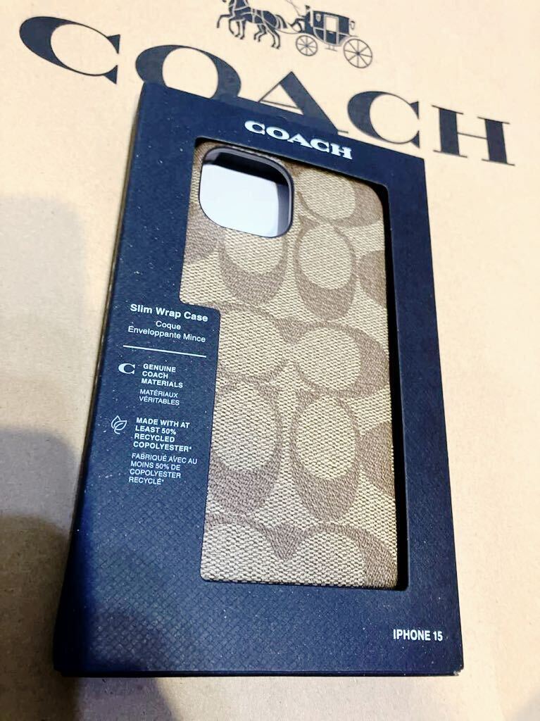 > 送料込●新品● COACH カーキ系B iPhone15 iPhoneケース 型押しレザー シグネチャー スマホケース コーチ コーテッドキャンバス