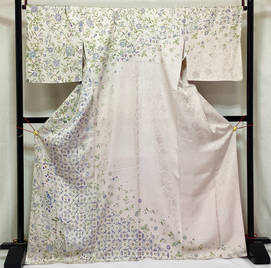 - 中古品 正絹 訪問着 袷きもの 紋綸子 友禅加工 共八掛 24018 t