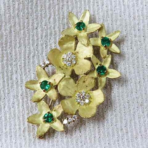 > 【値下げ交渉は質問欄より】K18YG製★素敵な花束風デザインブローチ&トップ☆エメラルド☆鮮やか!上品なアクセントトップ♪♪