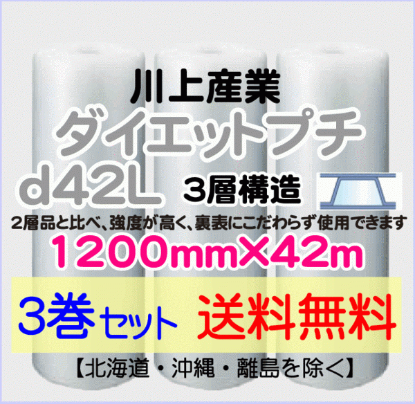 - 【川上産業 直送 3巻set 送料無料】d42L 1200mm×42m 3層 エアークッション エアパッキン プチプチ エアキャップ 緩衝材