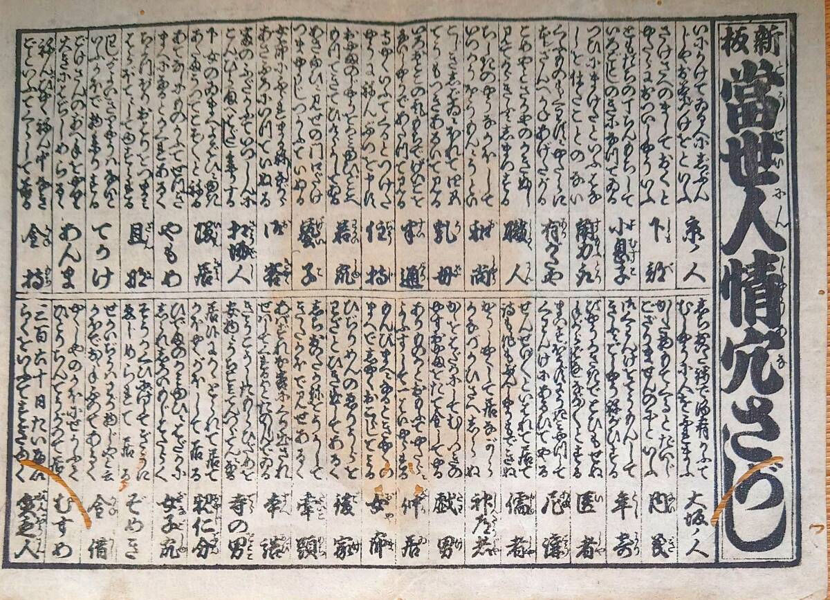 > f240409119〇一枚刷り 和紙木版 浪花みやげ初編 当世人情穴さがし ことば遊び しゃれ なぞ 判じ絵 見立番付 天保年間 塩屋喜兵衛板〇和本