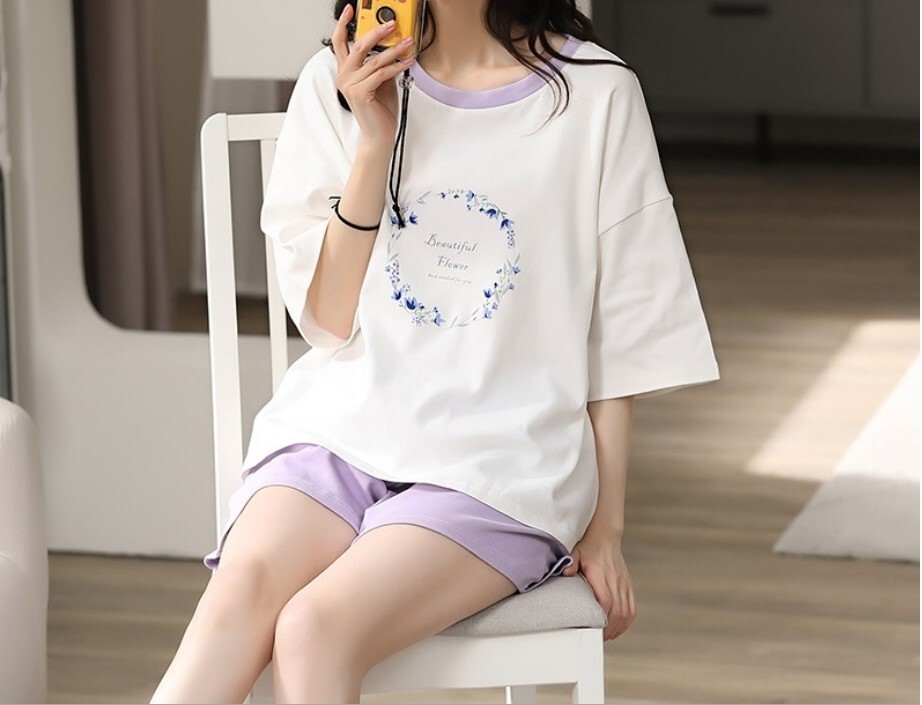 - 送料無料 新品 部屋着 ルームウェア 半袖 上下セット ホワイト×パープル サイズ XL 【Pza】 ⑦