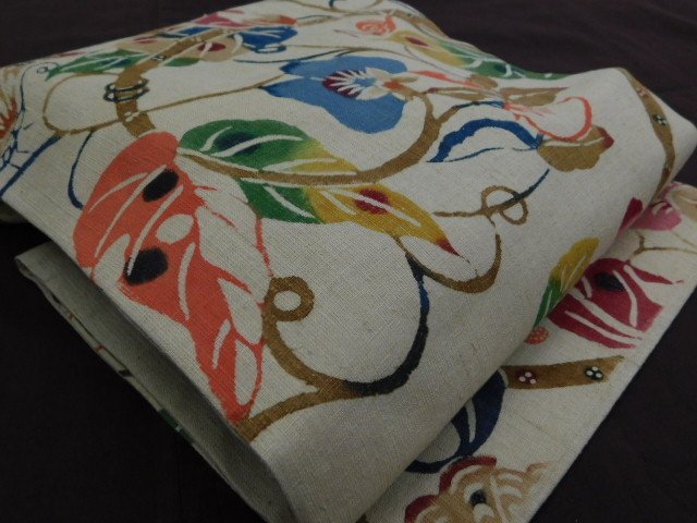> 〔楽布特選〕P28923 琉球紅型 真綿紬 名古屋帯 未使用仕立上がり品 オークション t