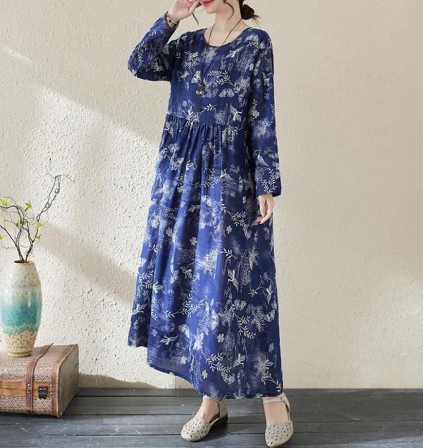 - LB292 カジュアル ゆったり 綿麻ワンピース 総柄 長袖 花柄ワンピース 大きいサイズ ロングワンピース ゆったり ロング丈 E