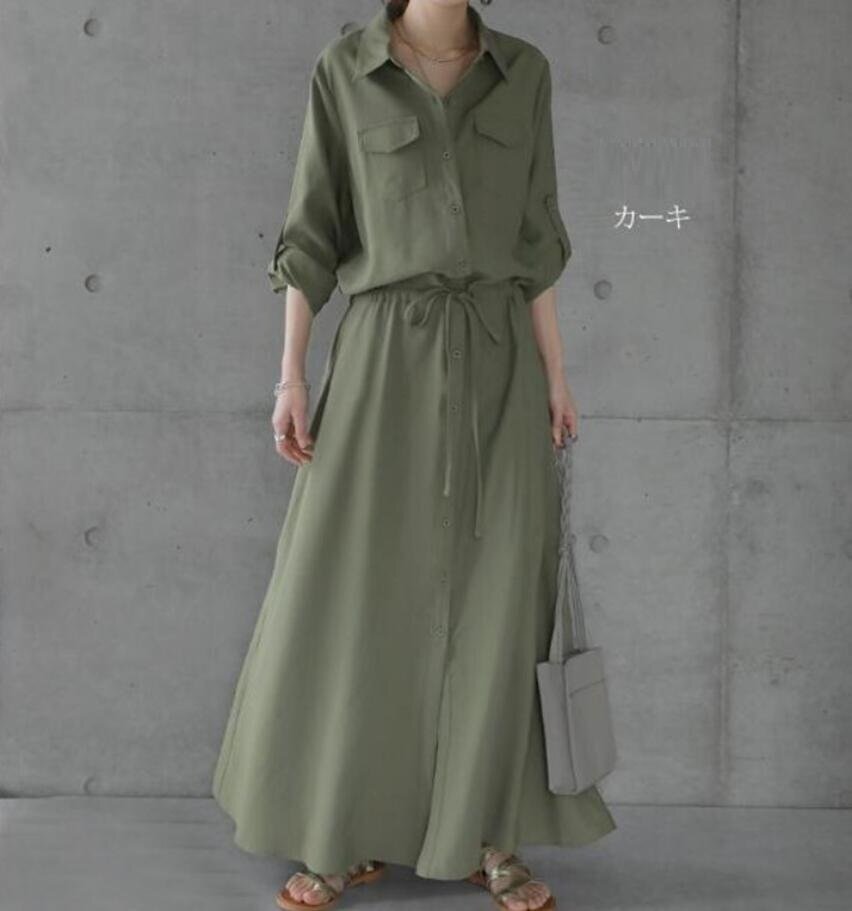 - LB095 ワンピース 理想の着痩せ ロングワンピース シャツワンピ ロング マキシ マキシワンピース レディース 大きいサイズ グリーン
