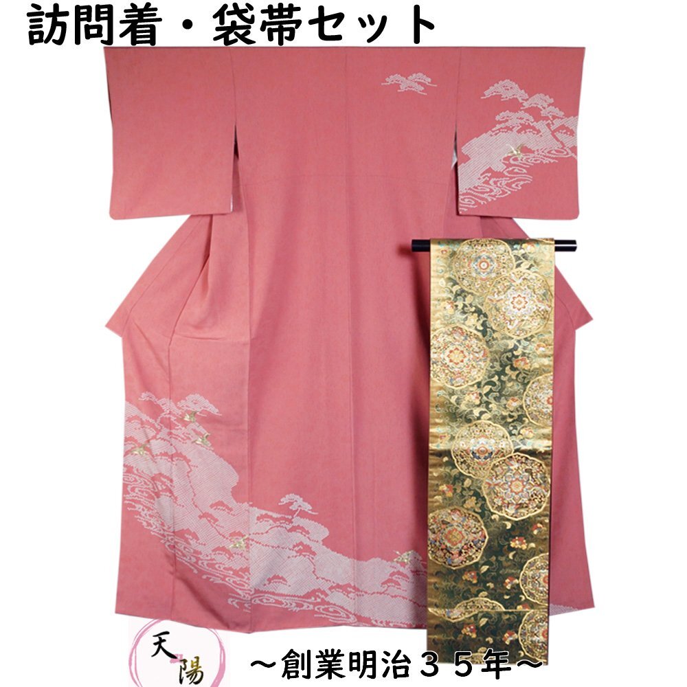 - 着物セット 訪問着・西陣まいづる 袋帯 2点 セット 磯辺に飛鶴模様 Sサイズ 刺繍 中古 訪問着 リサイクル着物 正絹 京都きもの天陽