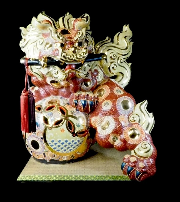 - 昭和期ビンテージ 伝統工芸品 九谷焼 八栄窯 須栄義作 金彩色絵魔除け玉乗り獅子 在銘品 刀咥 赤獅子 台座・房付き 1970〜1980年代 KKY604