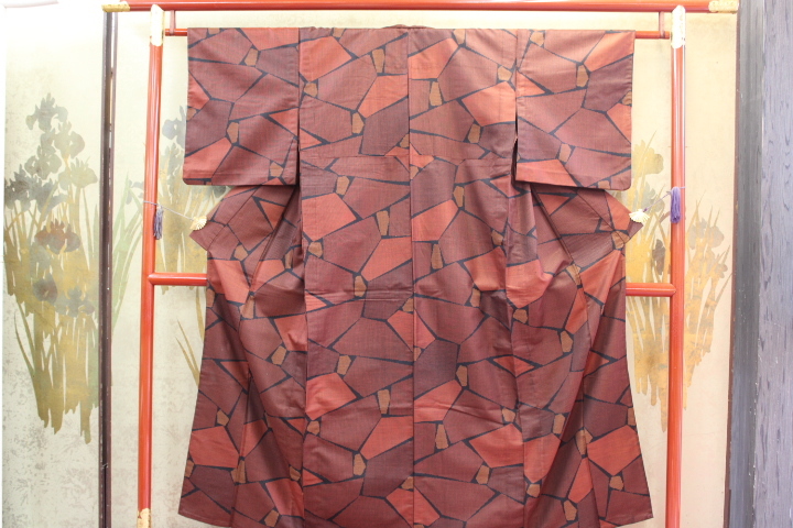 > きもの今昔6923 ウールのきもの バチ衿単衣仕立て 黒地に江rン地色の大島調絣柄 身丈149cm