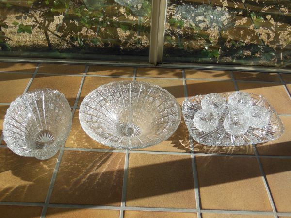> チェコ ボヘミア ギヤマン 切子カットガラス 8点 クリスタルガラス ボール ティー カップ & プレート フルーツボール(バカラ 検索用)美品