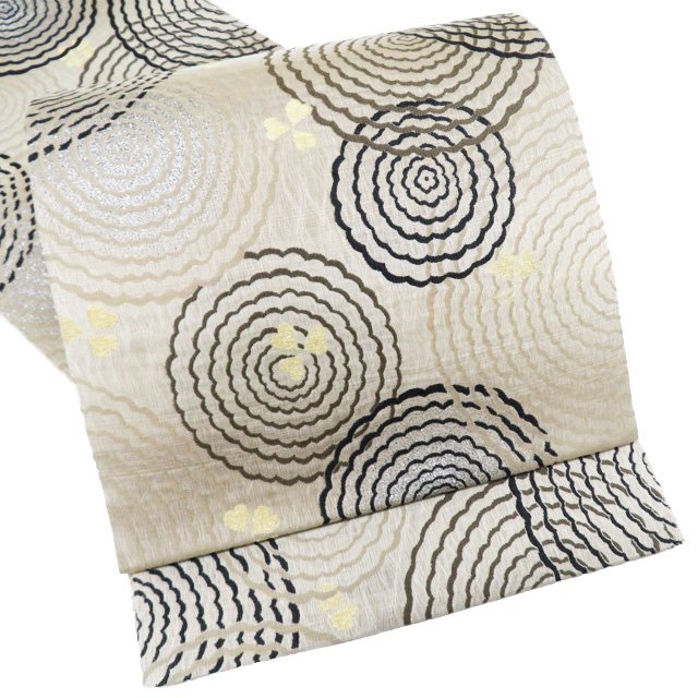 - 袋帯 中古 リサイクル 正絹 カジュアル 仕立て上がり 六通 花模様 箔糸 亜麻色 黒色 金銀 きもの北條 A1010-16