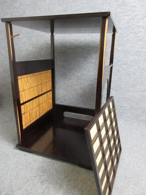 水指棚 吉野棚です。寸法は高さ48cm、縦横33cmです。状態は主観ですが良いと思います。140サイズ、ゆうパックで発送を予定しています。商品画像が実際の商品そのものですので、ご入札前にしっかりとご確認いただきますようお願いいたします。タイトルと画像が異なる場合、当方のミスの可能性がありますので、お手数をおかけしますが、その際にはご連絡いただければ幸いです。また、気になる部分や詳細な画像が必要な場合は、質問からお気軽にご連絡ください。配送方法については、通常の配送にはゆうパックやクロネコヤマトを利用します。大型商品や重量のある商品には、西濃運輸、佐川急便を選択することがあります。軽量で壊れにくい小物には、クリックポストやレターパックを利用することもあります。同梱の場合は送料が変わることがある点、ご了承ください。商品の写真はデジタルカメラや照明、撮影環境により実物の色と異なる場合があります。「真作」とタイトルにある商品について、万が一真作でない際には返品を受けます。中古商品であるため、記載しきれない経年劣化や時代の汚れ、傷みなどがある場合がございます。十分なご理解をいただいた上で、ご入札いただけますと幸いです。皆様のご入札を心よりお待ちしております。他にも色々出品中ですので是非ご覧ください。