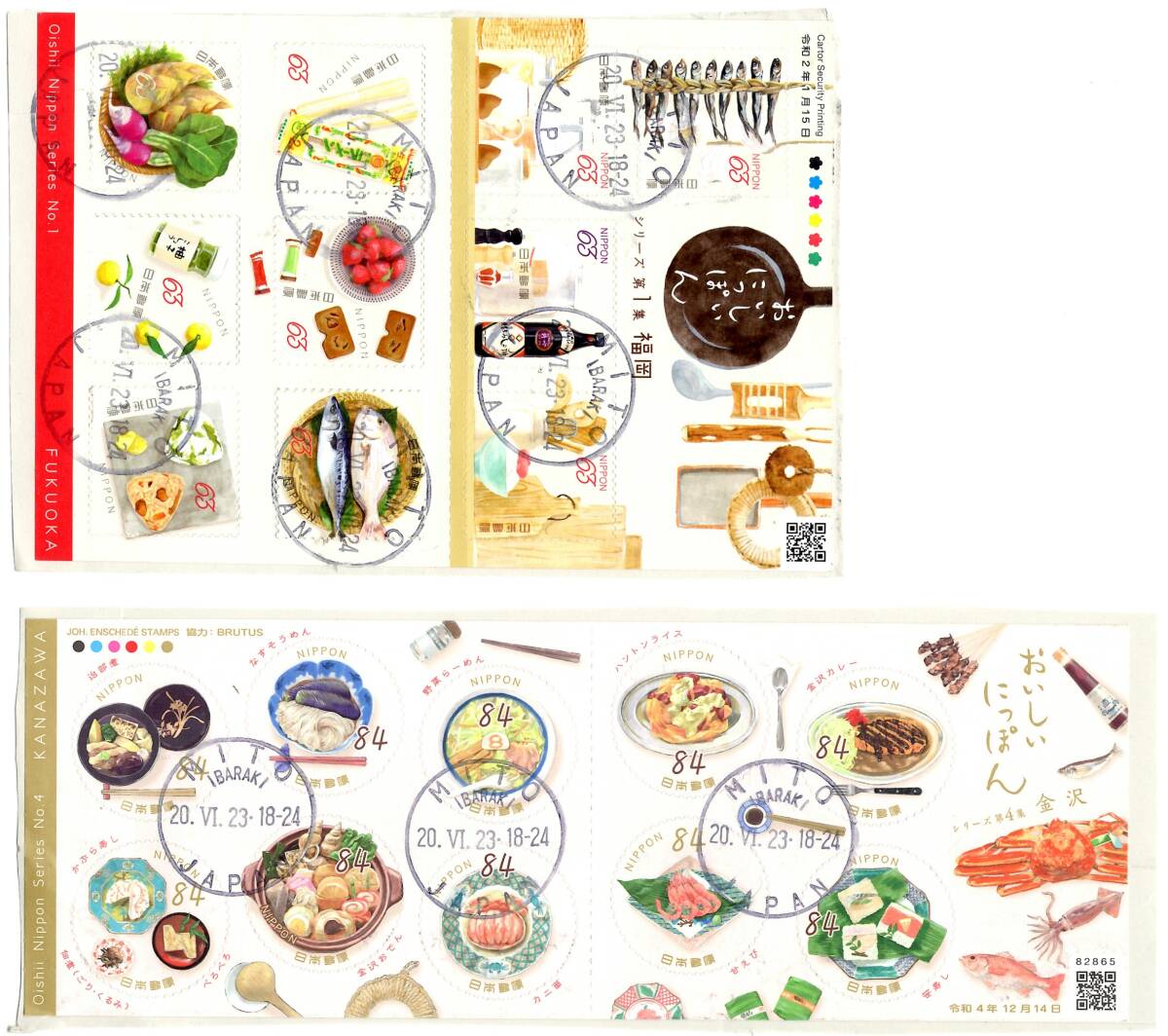 > おいしい日本シリーズ 第1集「福岡」63円10種ペーン 第4集「金沢」84円10種ペーン (2点) 実逓 使用済 日本 切手 令和2・4年