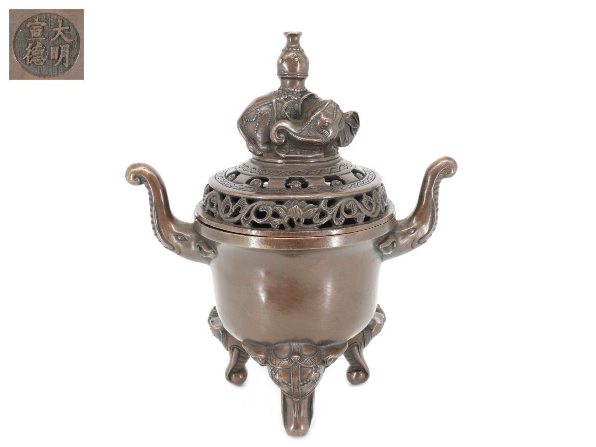 - 銅製 香炉 象透かし蓋 象双耳 象四足 在印在銘 香道具 A177