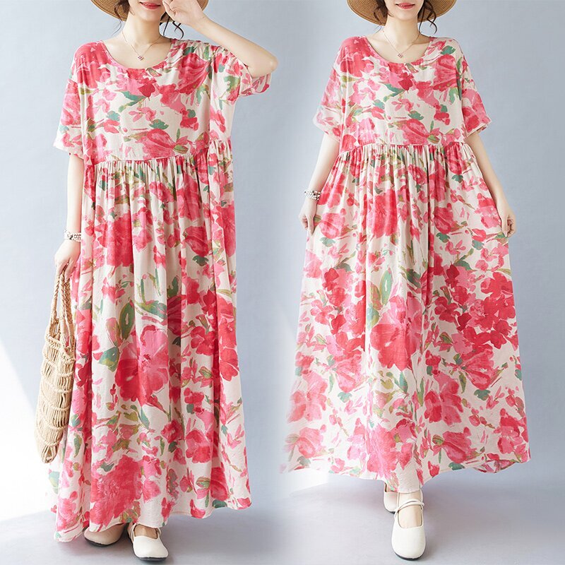 - 新入荷/ ワンピース 夏 レディース 花柄 ロングワンピース 半袖 マキシワンピース 大きいサイズ エスニックワンピース 綿麻風 ゆったり/E