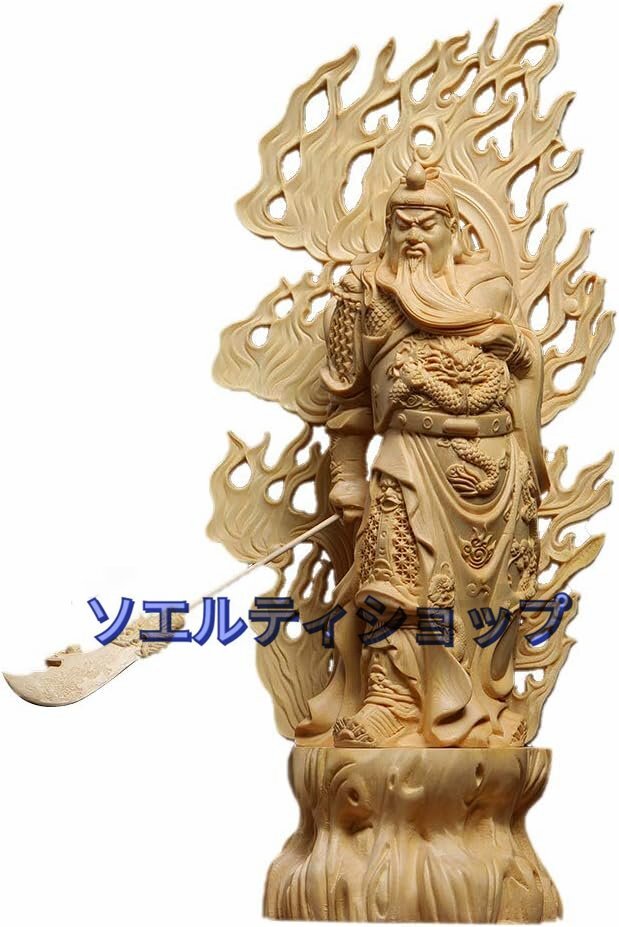 - 関羽 雲長 木彫り 三国志 関羽像 武財神 桧木製 火炎光背 青龍偃月刀 風水 開運 昇運 機運上昇 高さ26cm