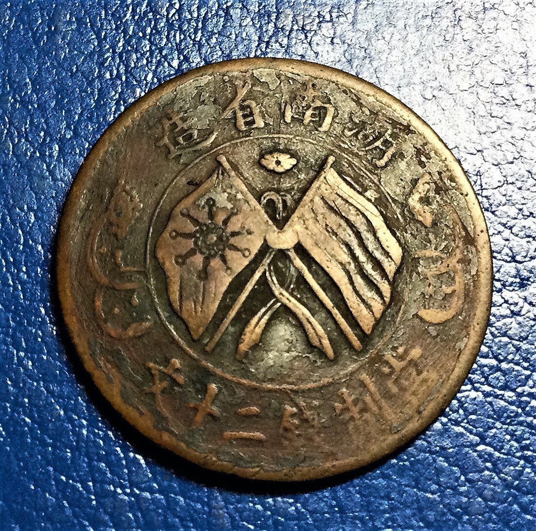 - M018 中国古銭【當制銭二十文】 湖南省造 菊紋 32㎜ 10g