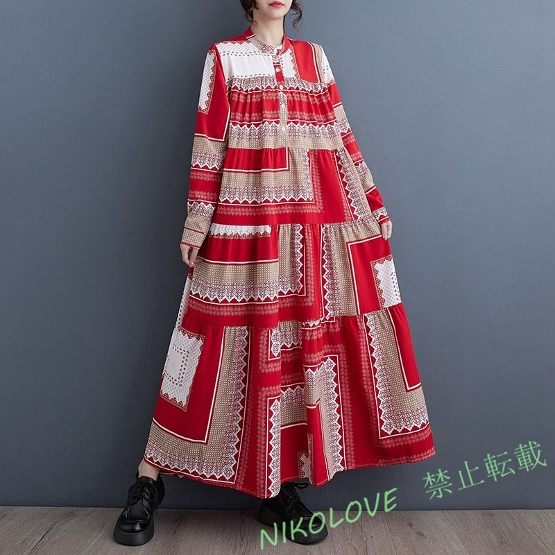 > 新品復古 レディース カジュアル 配色 プリント 大きいサイズ体型カバー ロング丈 長袖ワンピース 赤 LE780