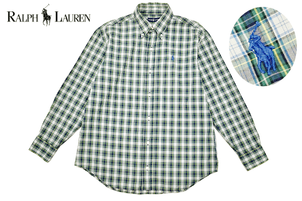 - Y-7389★送料無料★超美品★Ralph Lauren ラルフローレン★正規品 グリーン系 チェック ポニーロゴ刺繍 長袖 ボタンダウンシャツ XS 150cm