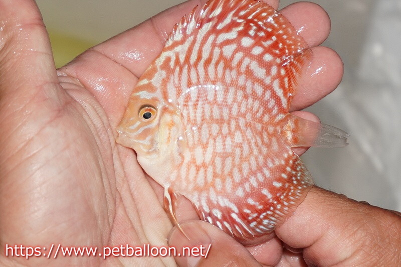 赤と白のパターンがバランスよく入り、非常に派手な発色を見せるピジョン系ディスカス。成長とともに変化するパターンも楽しみの一つと言えます。