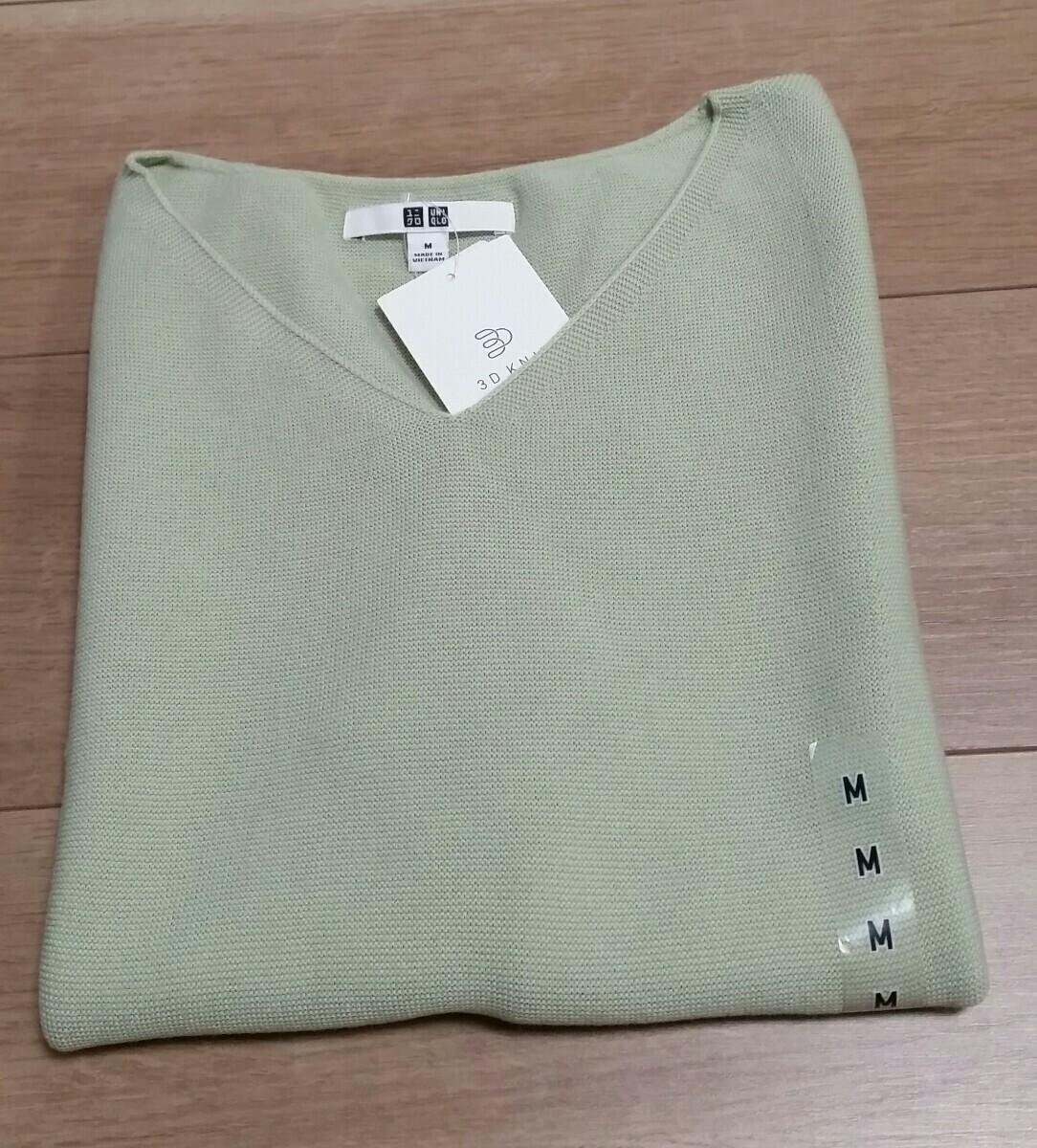 - Mサイズ 新品 未使用 ユニクロ UNIQLO 3Dコットン パフスリーブセーター グリーン(若葉色系) 5分袖 綿100% Vネックニット サマーセーター