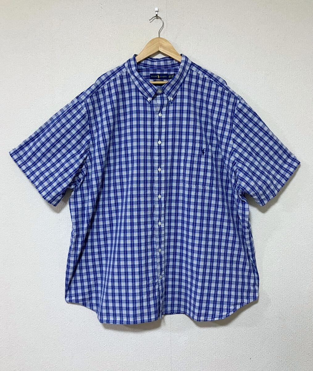 > 【レアサイズ】Ralph Lauren ラルフローレン シアサッカー素材 オンブレチェック 刺繍ロゴ 半袖シャツ ボタンダウン ビッグサイズ 4XL BIG
