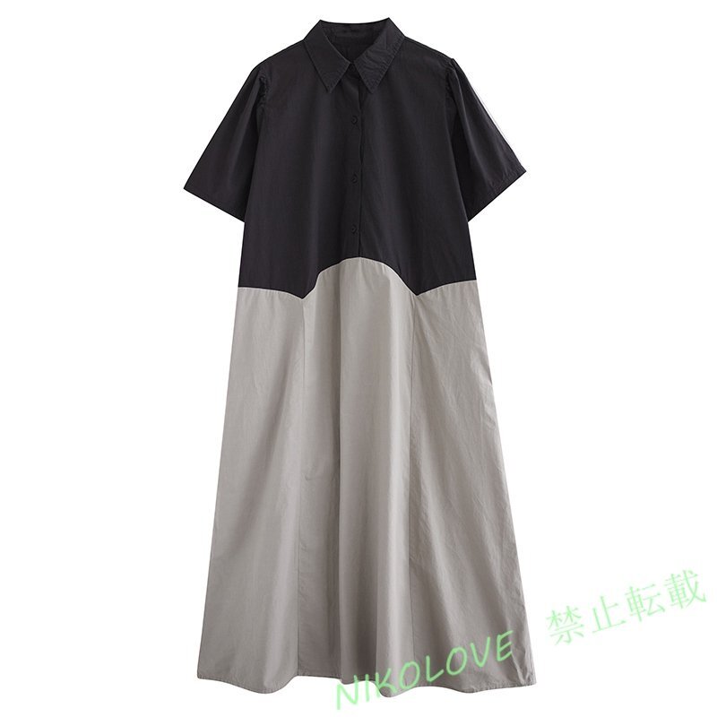 - 新品カジュアル 体型カバー レディース ゆったり大きいサイズ 配色 切り替え 半袖ロングワンピース F 杏 LH111