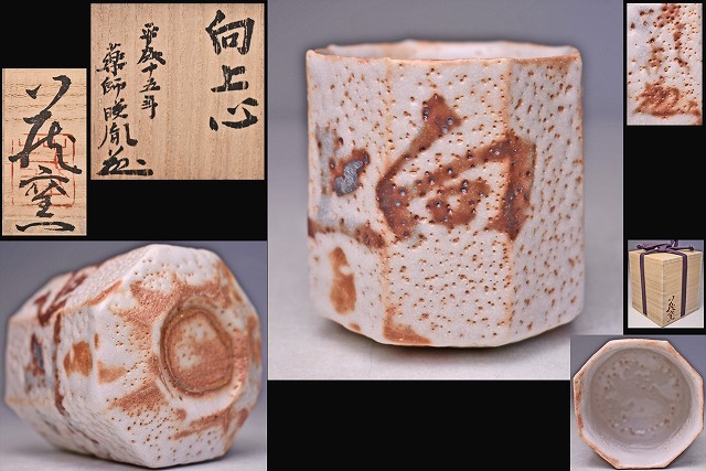 > 鈴木蔵 窯 ★ 薬師寺 元管長 安田暎胤 字 ★ 絵志野八角湯呑 ★ 共箱 書付箱 ★ 向上心 ★ 薄手の作り ★ 人間国宝 ★ suzuki osamu