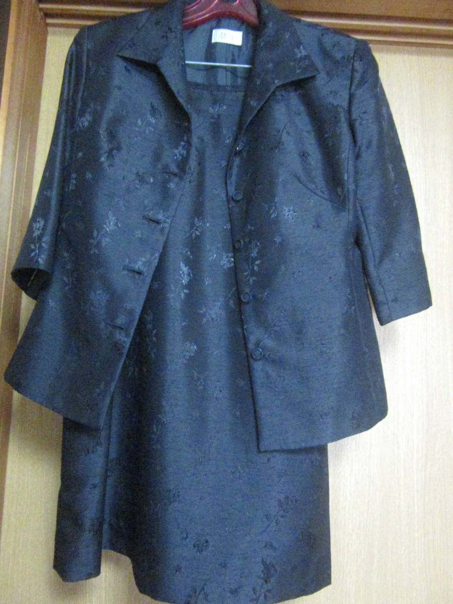 > ★ オンワード樫山 MLLE ノエビア ローズ織柄 ブラック 片スリットのスカート ジャケットスーツ 共布コサージュ付き 少々訳あり★