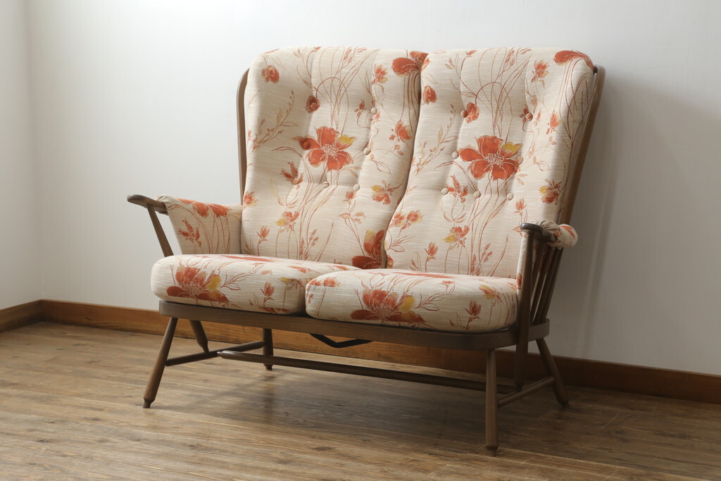 > R-061602 イギリスビンテージ 超美品 ERCOL(アーコール) エバーグリーン ハイバック二人掛けソファ(アームソファ、ラブソファ、2人掛け)
