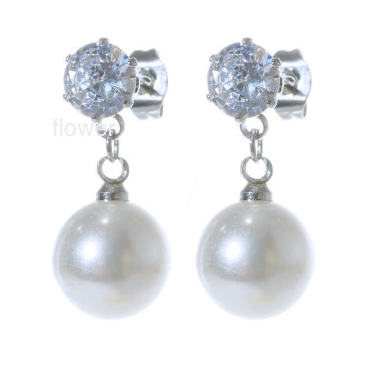 - 新品 316l サージカルステンレス 大粒 AAA+ CZ ダイヤモンド パールピアス 抗アレルギー シルバーピアス ステンレス 真珠 送料無料