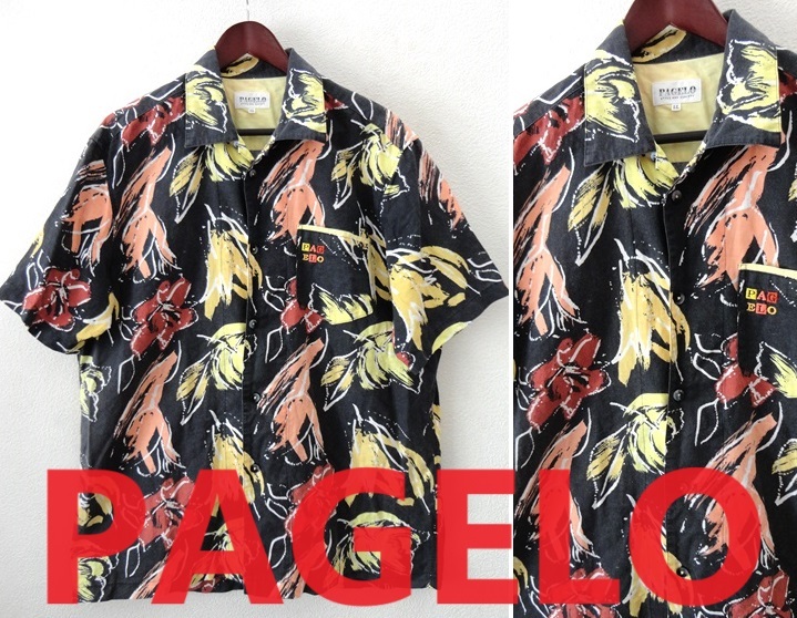 - ANGELO JAPAN■PAGELO:パジェロ■リネン混コットン■ロゴ刺繍入り 花柄 アロハシャツ■ブラック■LLsize(XL)■麻